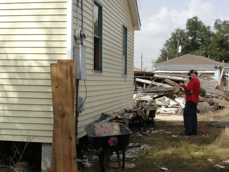 Once again a train of wheelbarrows to take out debris. The long boards on the side are being saved to make ramps up to the top of the debris piles. |